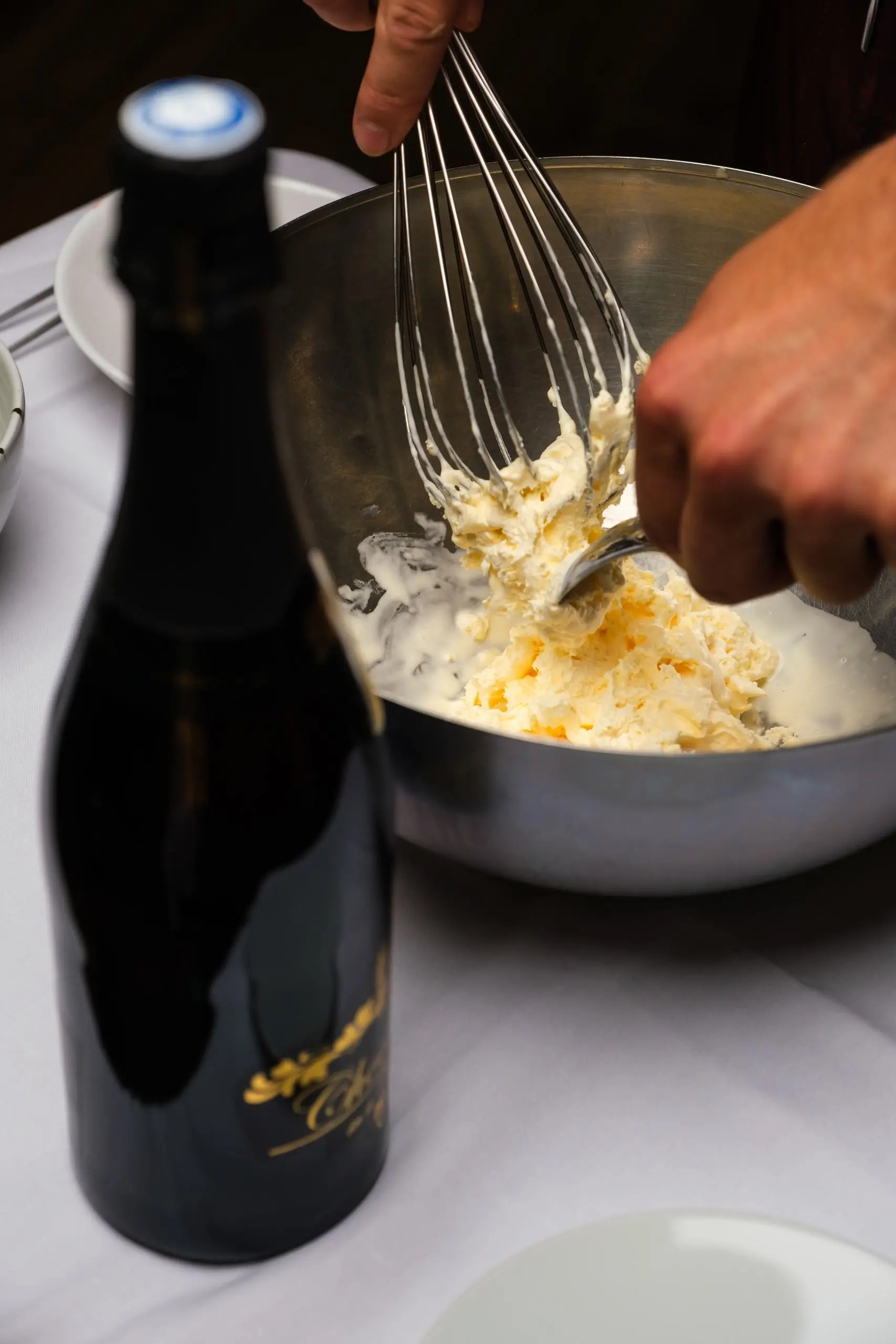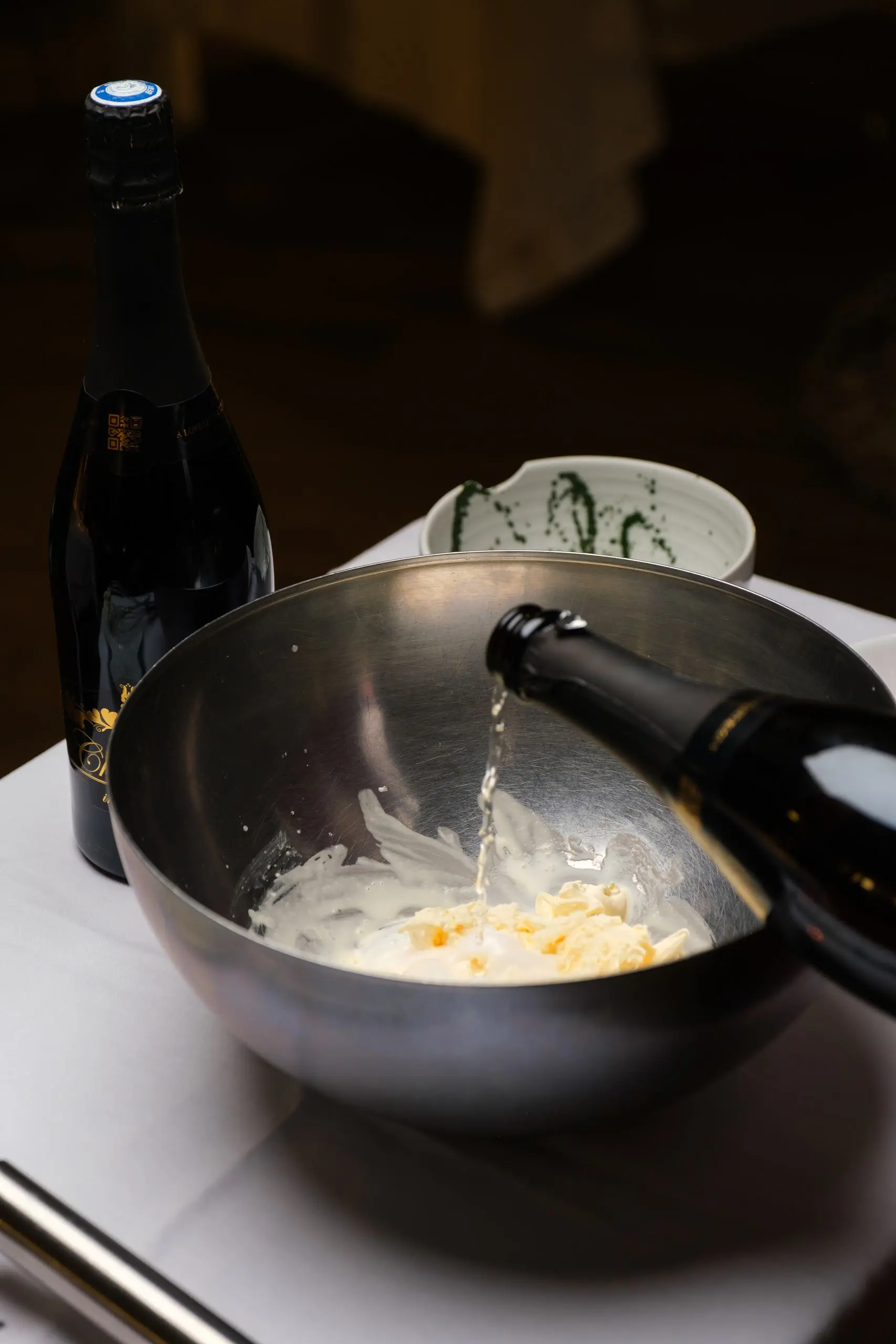 Risotto crémeux au Chocolate in a Bottle, crevettes rouges crues siciliennes, myrtilles et flocons de chocolat noir