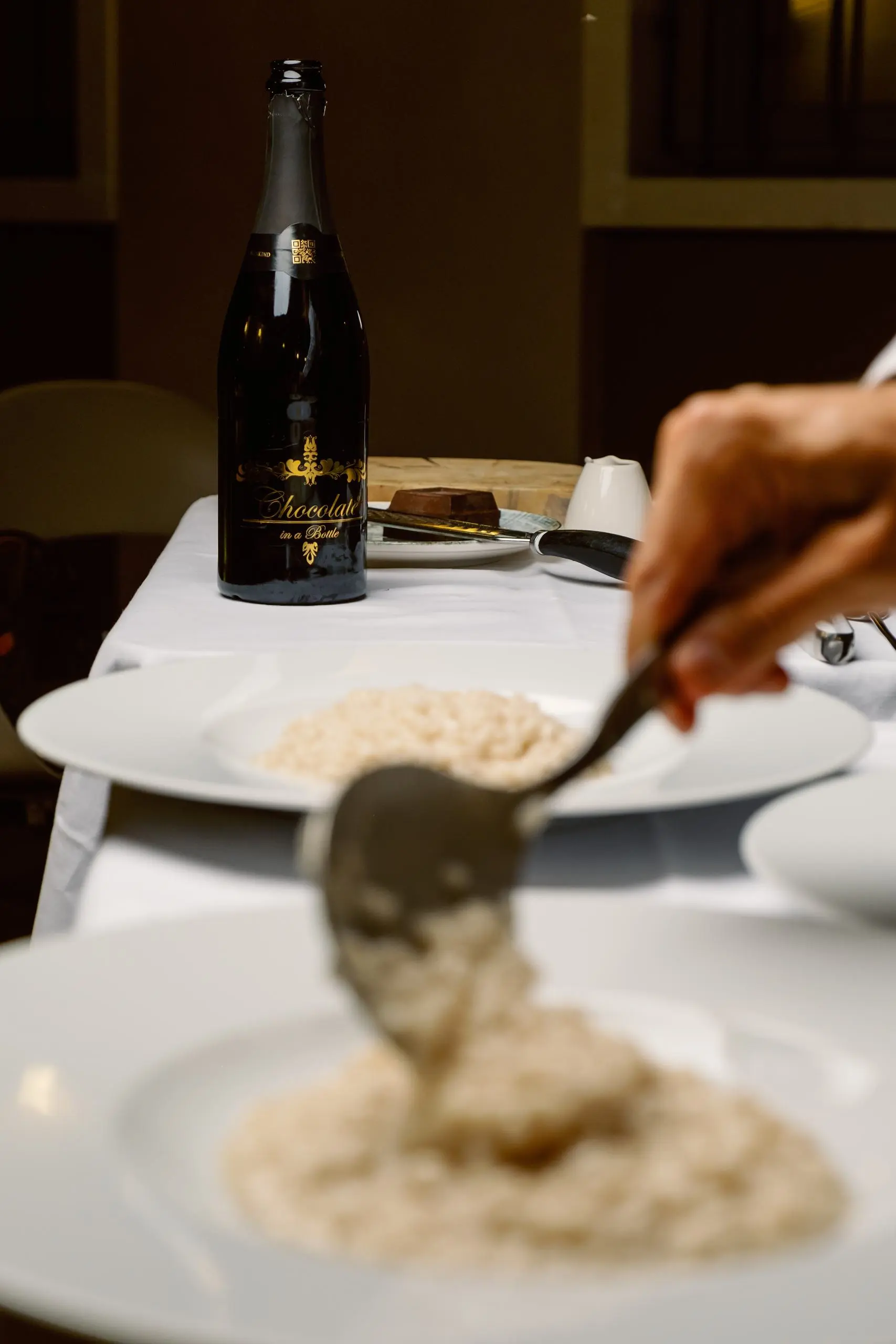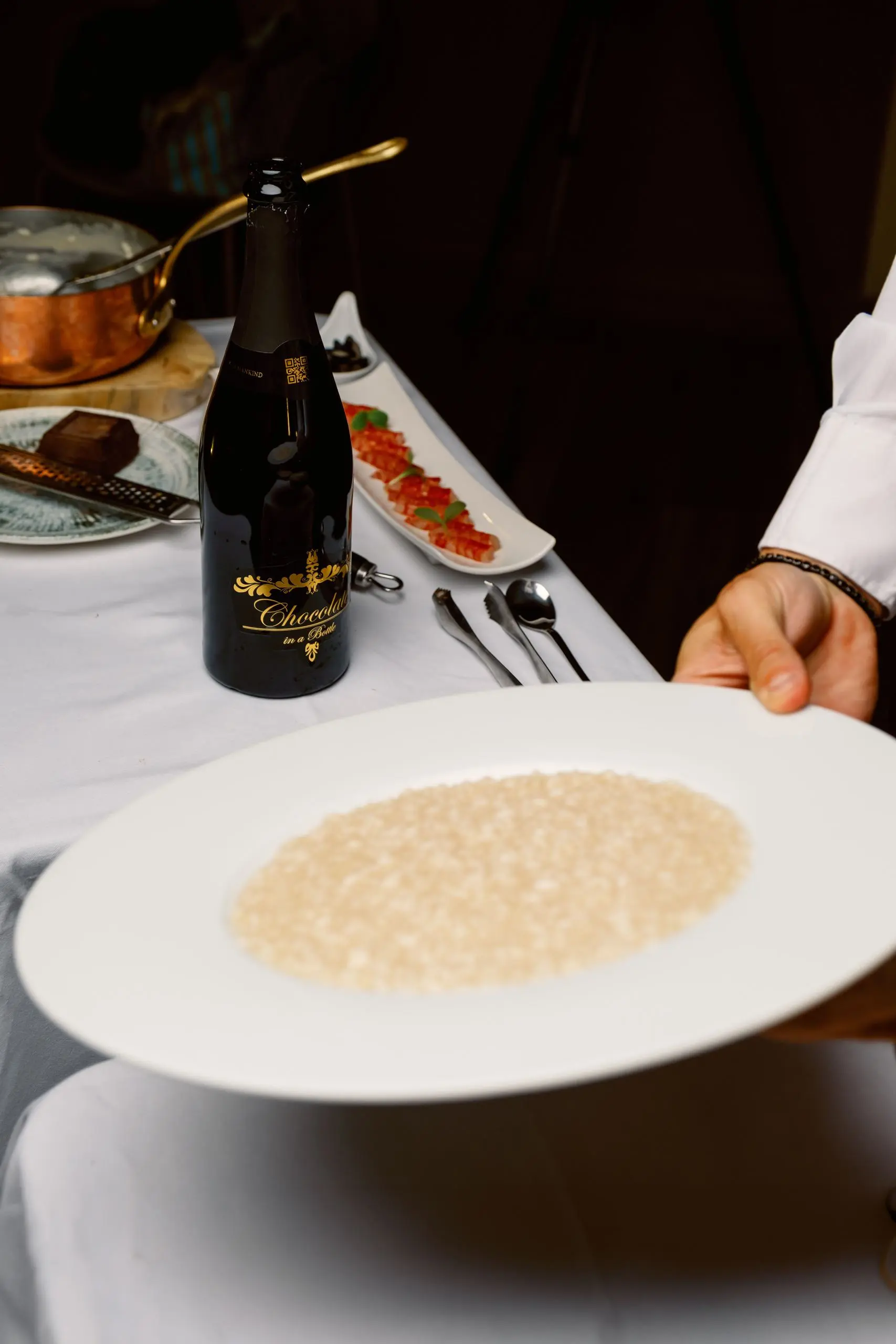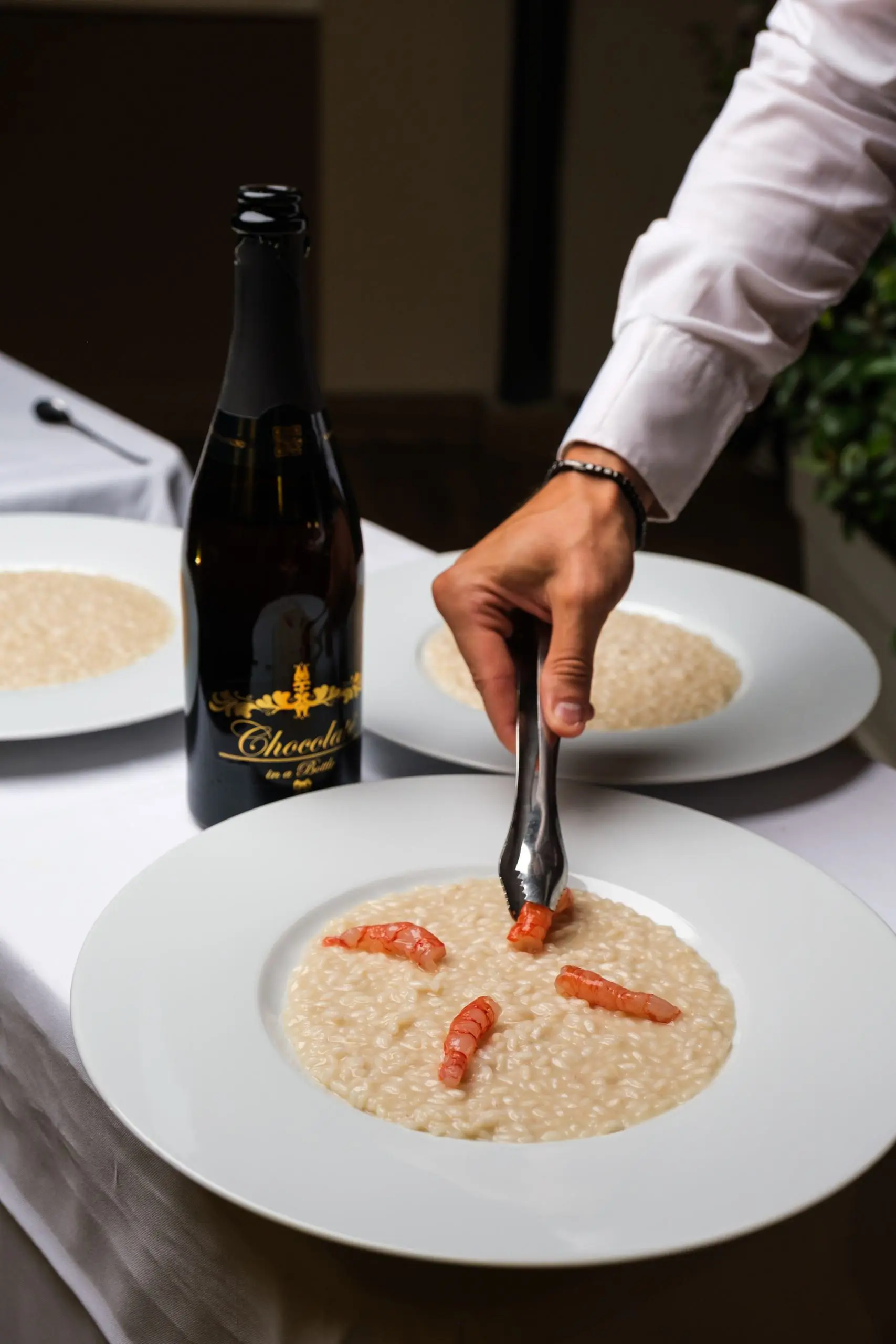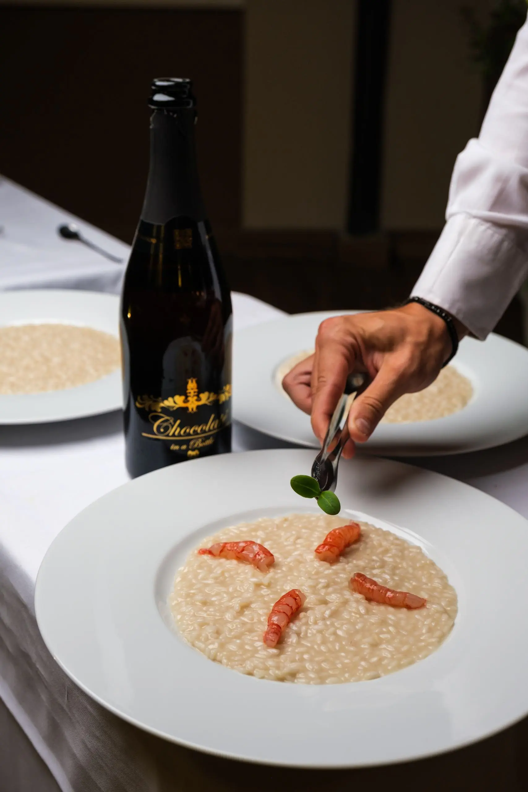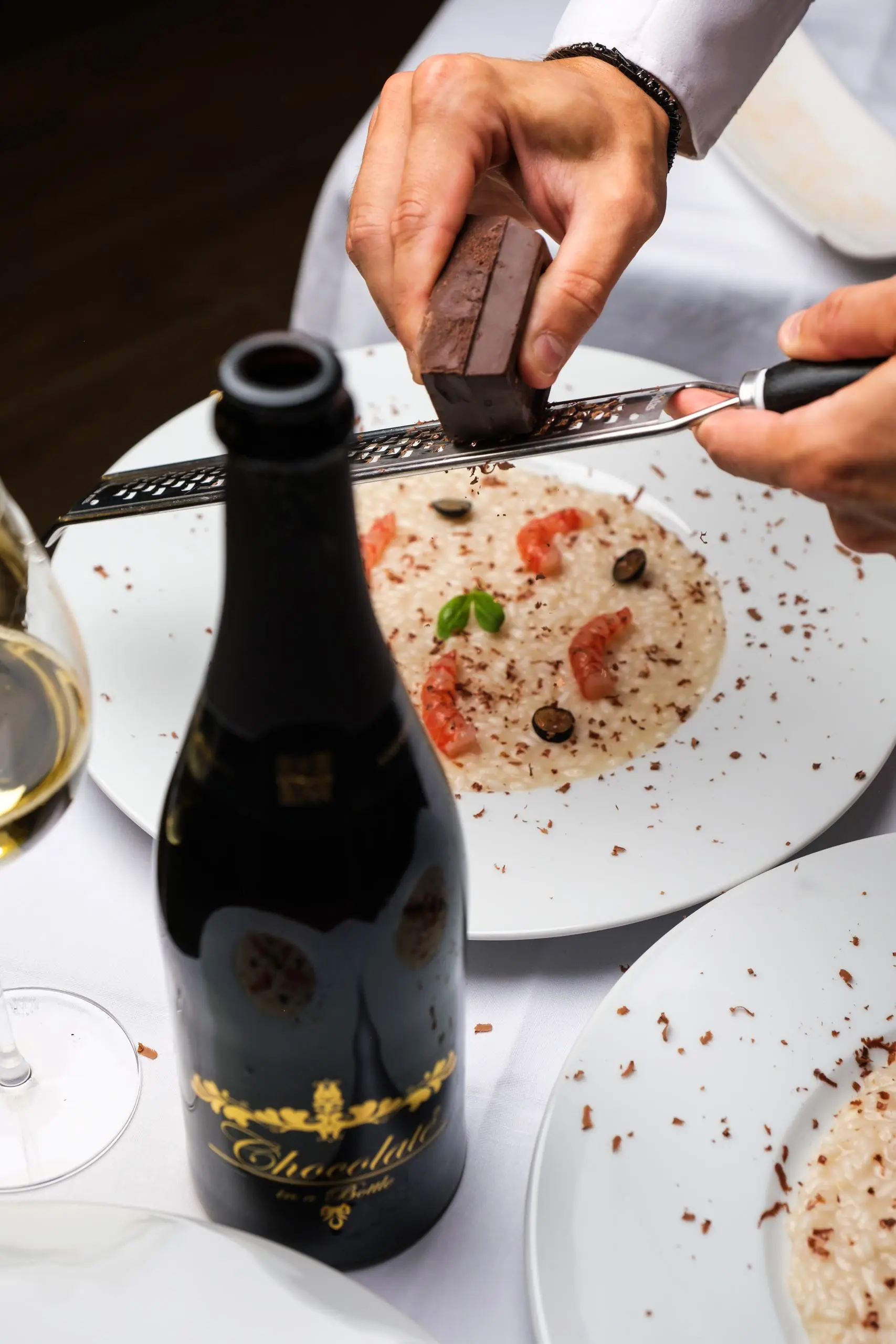 Faites griller le riz avec un peu d'oignon et d'ail, puis poursuivez la cuisson avec le bouillon de poisson préparé précédemment. Une fois cuit, incorporez le Chocolate in a Bottle hors du feu et servez. Garnissez de crevettes rouges siciliennes crues, de myrtilles fraîches et de copeaux de chocolat noir.