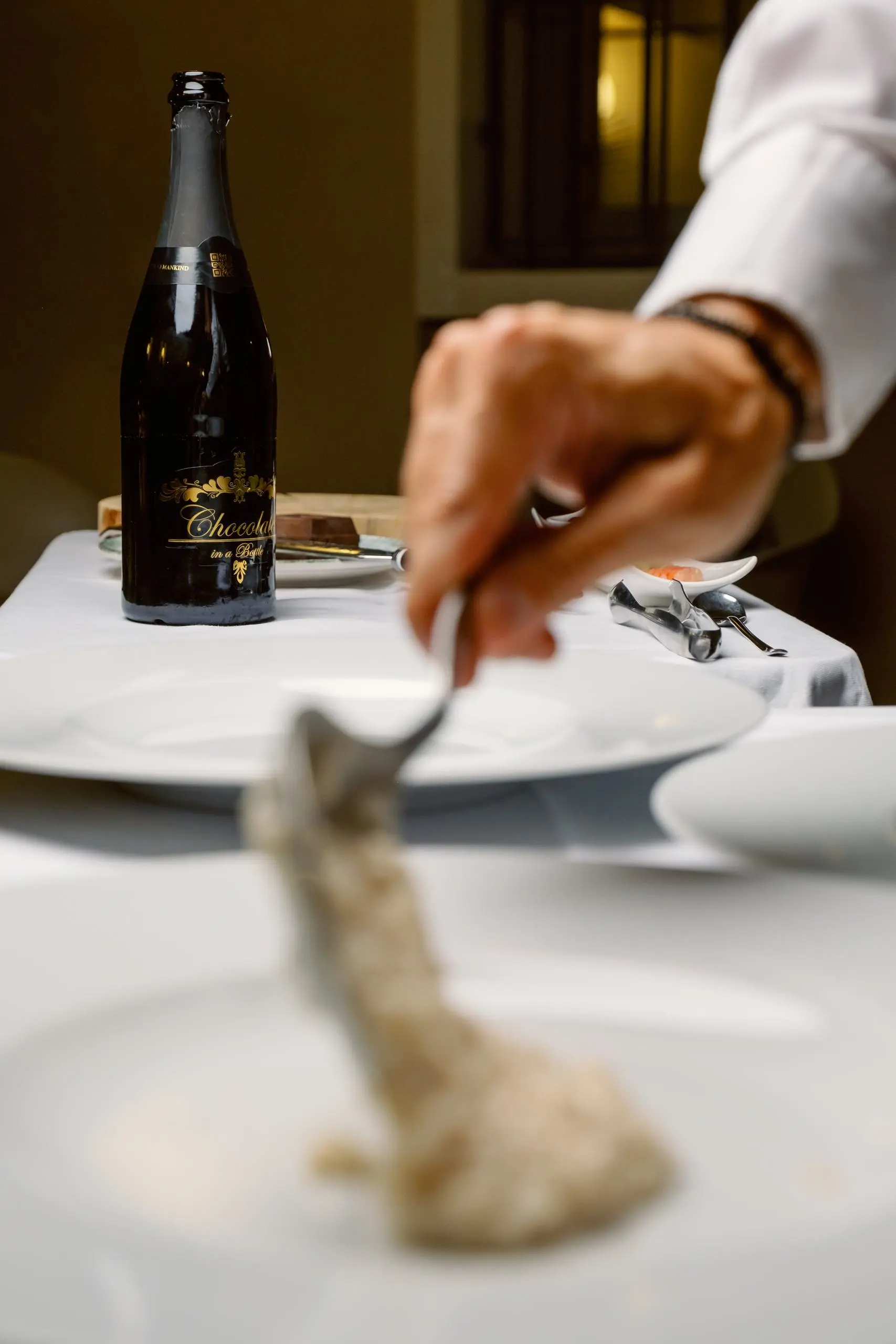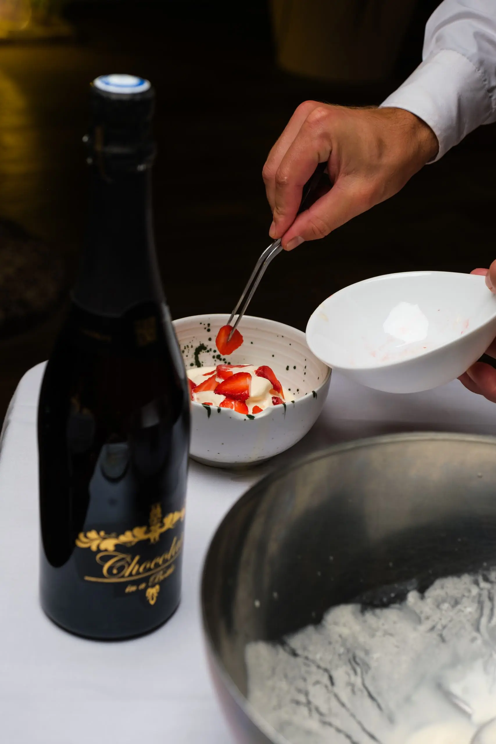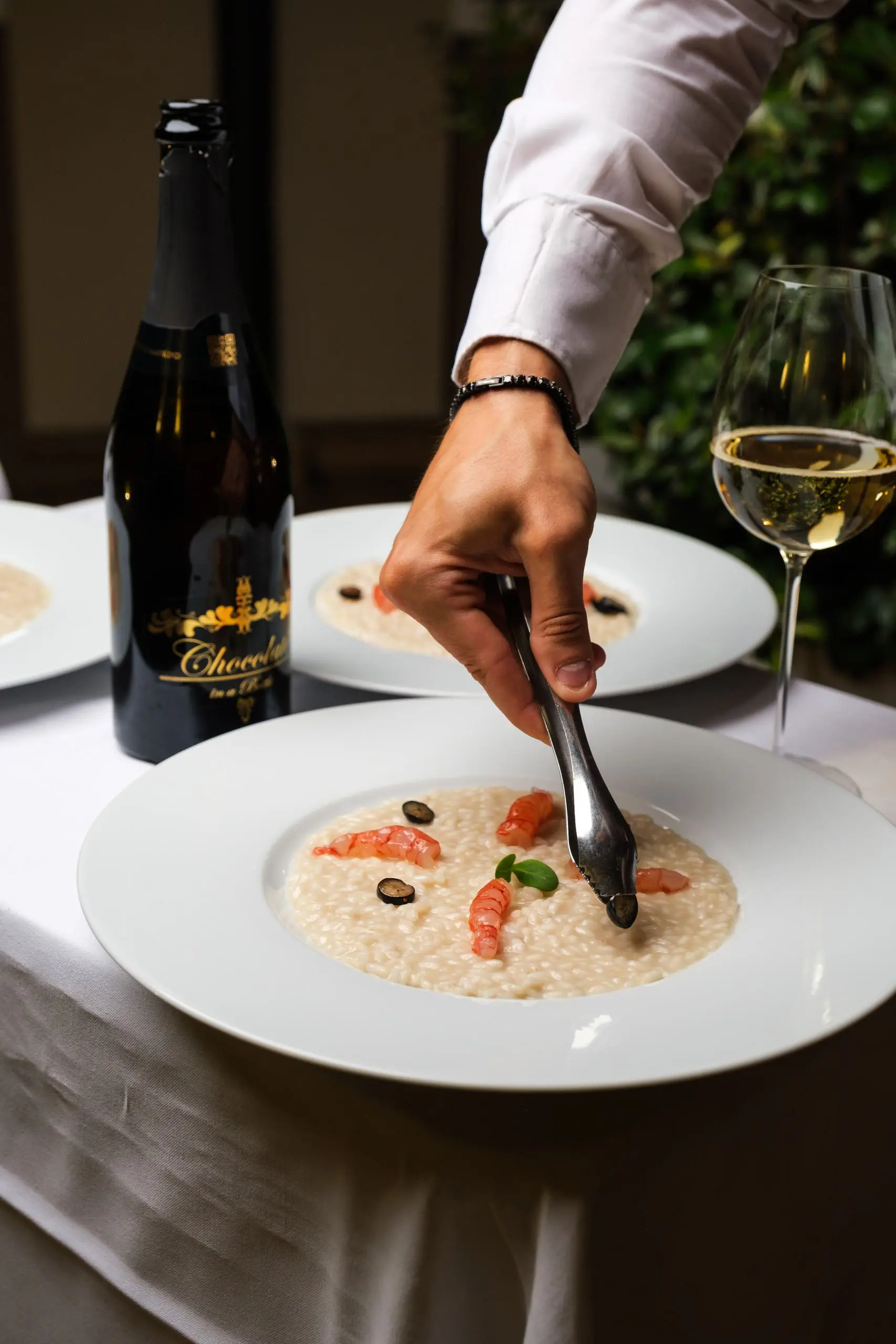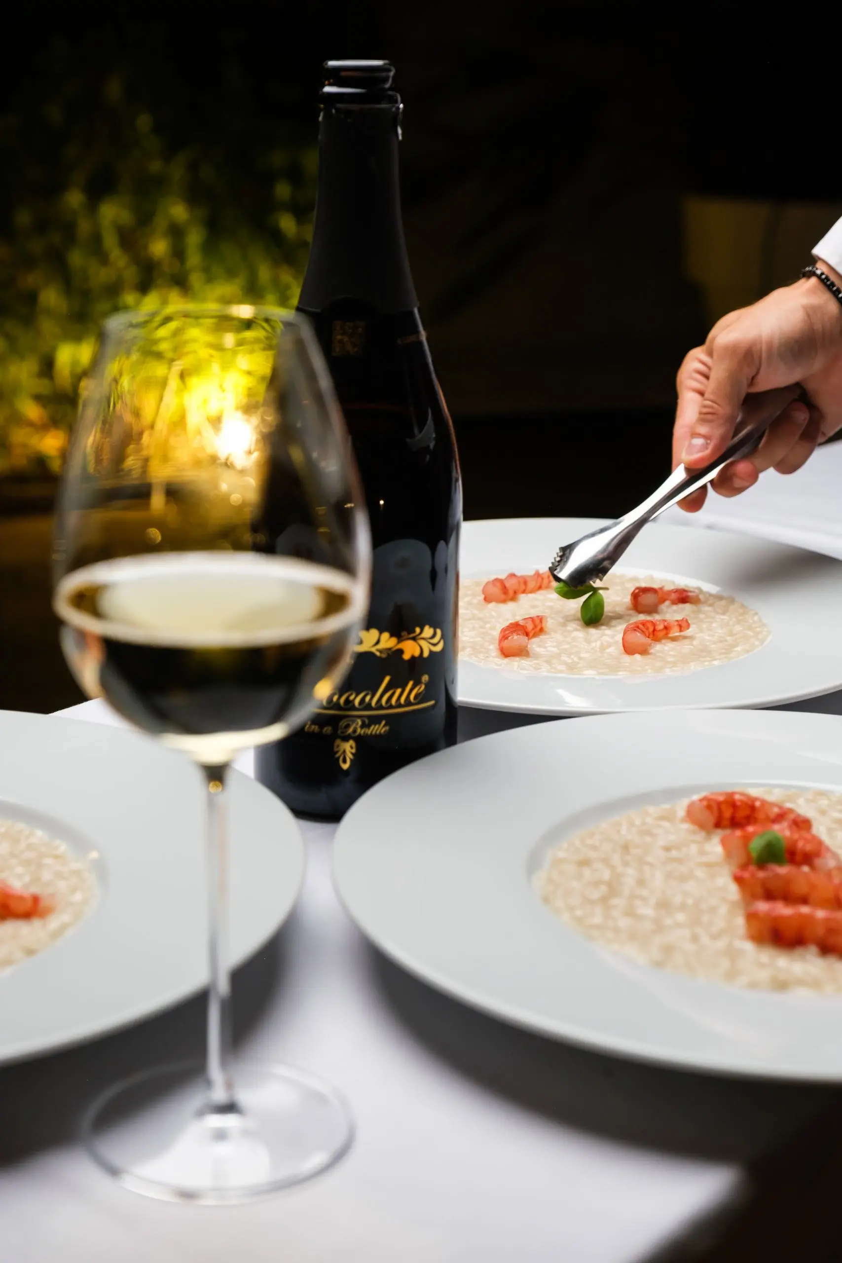 Faites griller le riz avec un peu d'oignon et d'ail, puis poursuivez la cuisson avec le bouillon de poisson préparé précédemment. Une fois cuit, incorporez le Chocolate in a Bottle hors du feu et servez. Garnissez de crevettes rouges siciliennes crues, de myrtilles fraîches et de copeaux de chocolat noir.