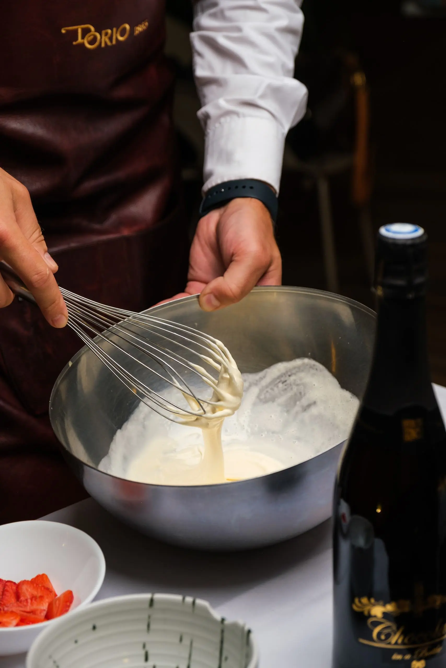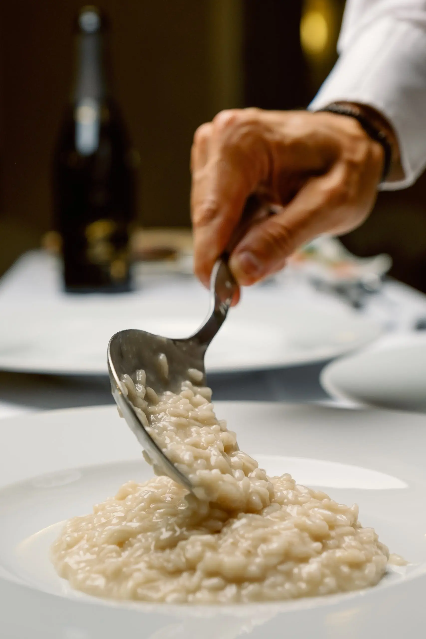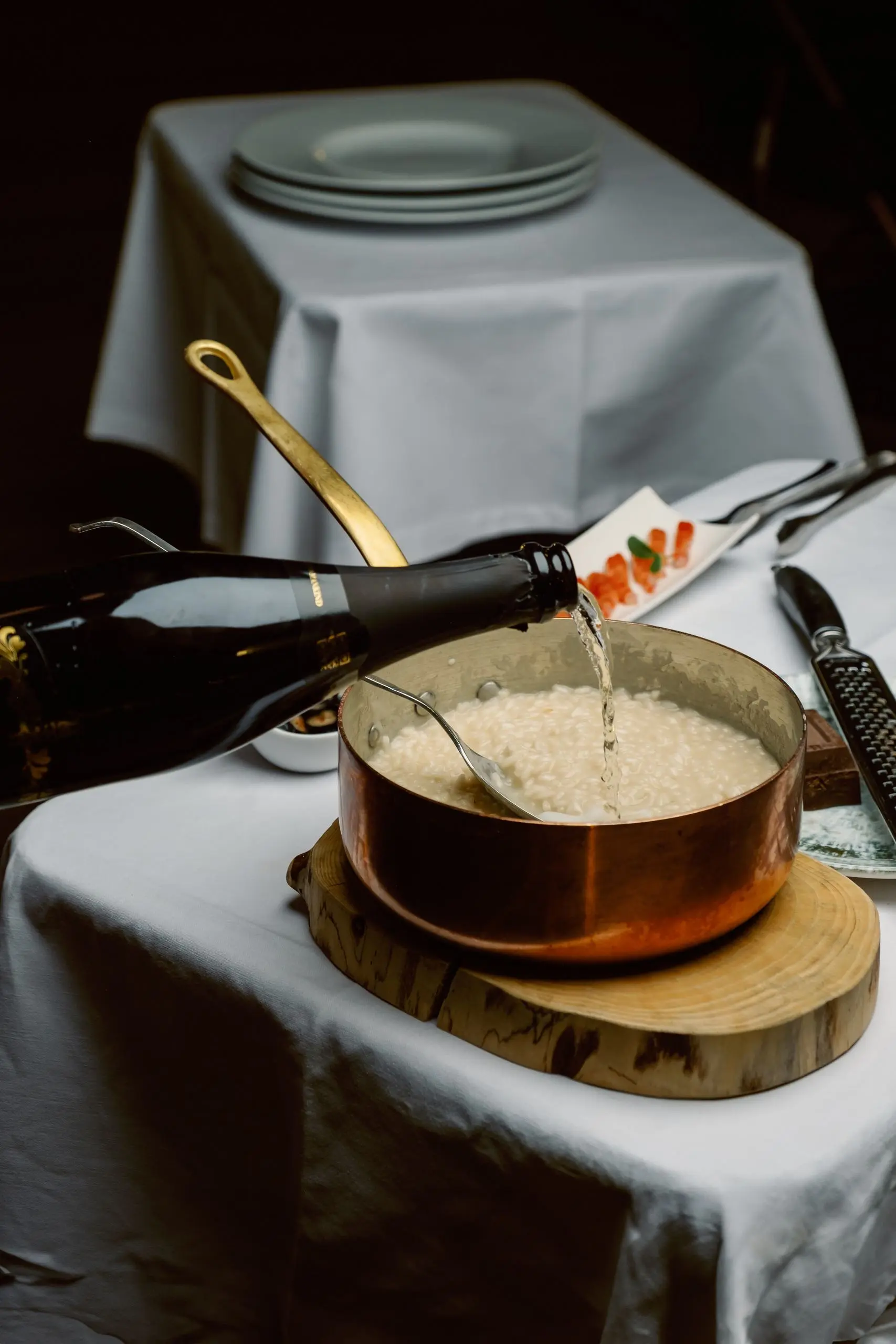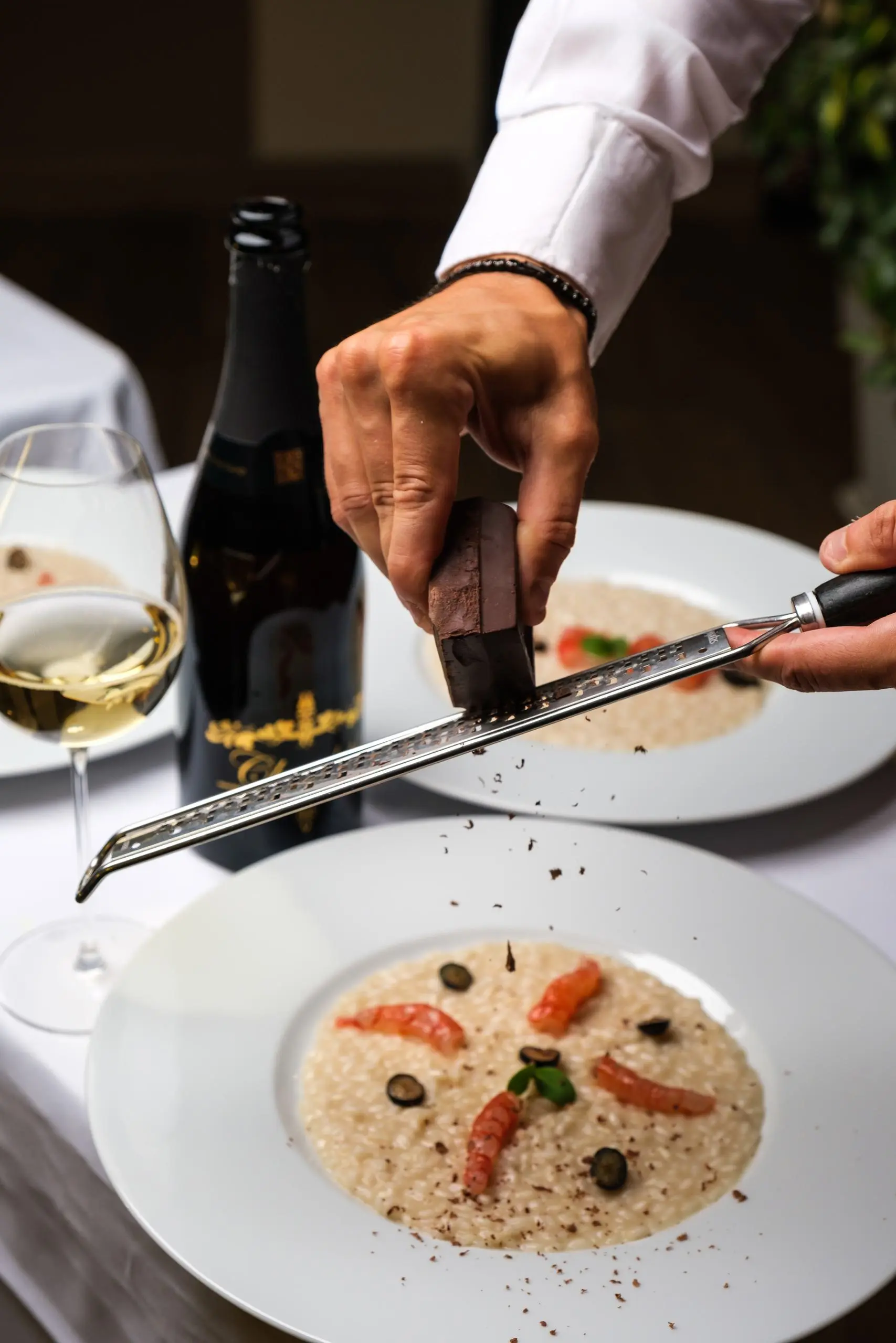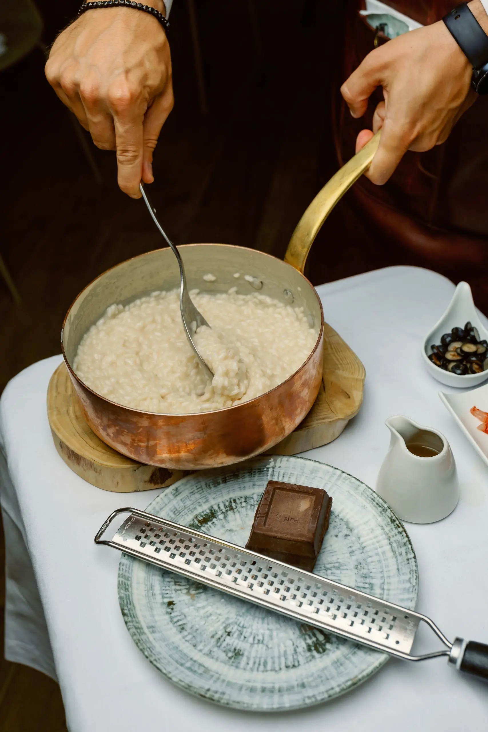 Faites griller le riz avec un peu d'oignon et d'ail, puis poursuivez la cuisson avec le bouillon de poisson préparé précédemment. Une fois cuit, incorporez le Chocolate in a Bottle hors du feu et servez. Garnissez de crevettes rouges siciliennes crues, de myrtilles fraîches et de copeaux de chocolat noir.